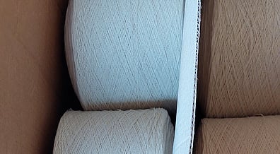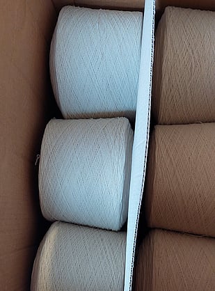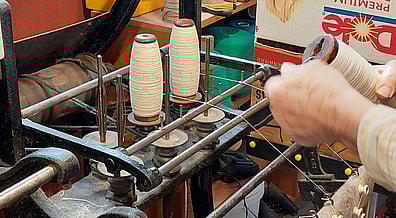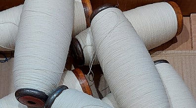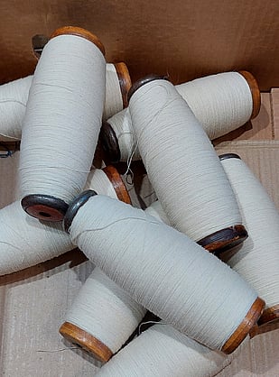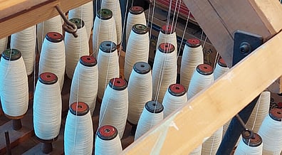 The first step to to wind the yarn off the large cones onto our wooden bobbins. Rod will be winding nearly 150 bobbins to fit onto the warping frame.