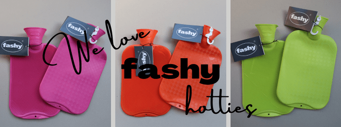 We have a good selection of Fashy hot water bottles back in stock, either plain in red and blue, or single rib in a variety of colours.