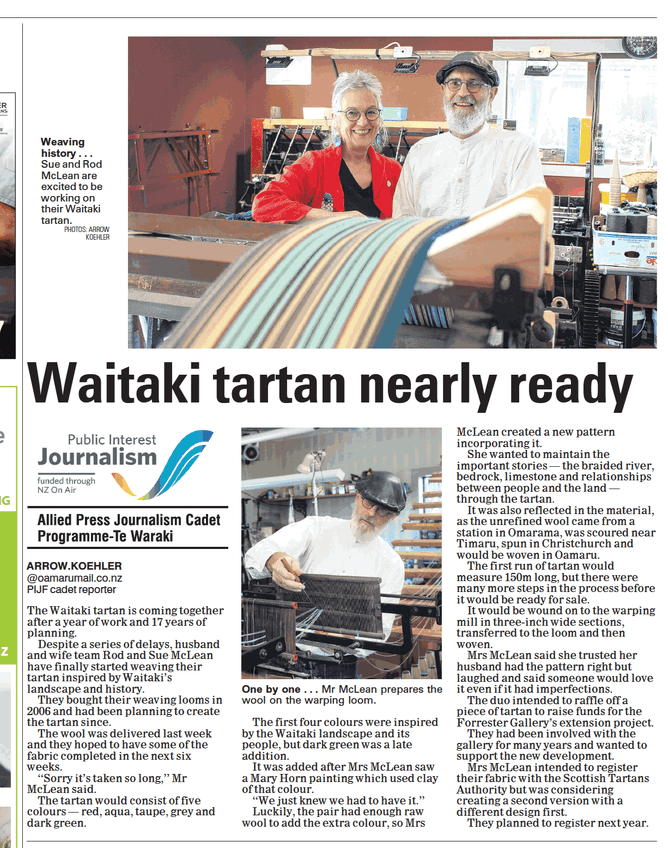 Huge thanks to Arrow Koehler from the Oamaru Mail for coming to visit the other day, and writing this update on our Waitaki tartan journey. Local media for local happenings is great!