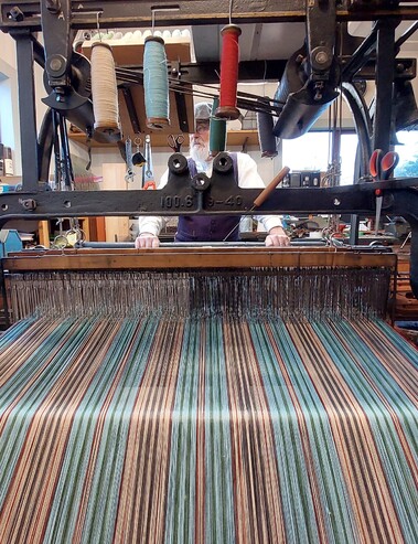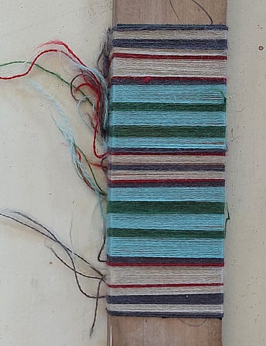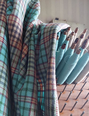 Another limitation is our warping frame; we can only warp up one three inch section at a time, therefore there are a lot of bobbin changes. These limitations are all part of our Waitaki tartan story.