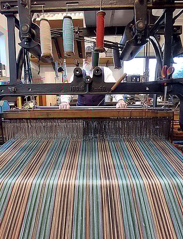 Our c1895 Hattersley Domestic Weaving System also provided us with a few design challenges. One of the limitations is the rotating shuttle box, which can only click once to the left or right for each colour change. We have five colours and six shuttles, so trying to tell complex cultural, historical and geographical stories is tricky; they need to be reduced to their essence.