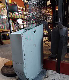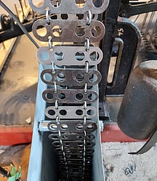 Our c1895 computer system that tells the rotating shuttle box when to turn clockwise or anti-clockwise to change the weft stripe colours. The Foulden collection had such a long chain that Rod had to design and make a larger box to hold it all.