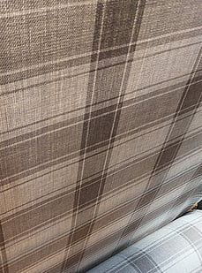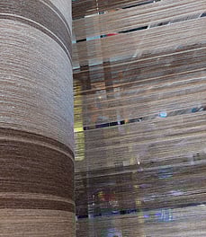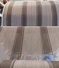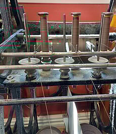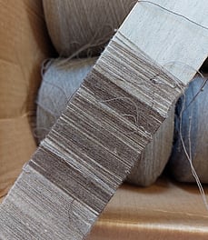 Showing the stripes on the warping mill. Each stripe has to be wound individually onto our sectional warping mill, meaning the chocolate bobbins come off and the taupe bobbins go on.