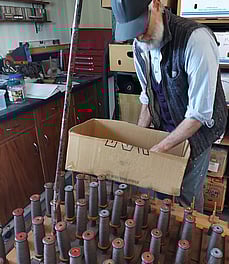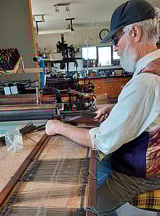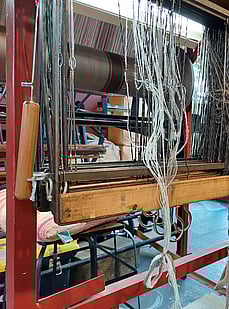 Here Rod is tuning the loom, making sure everything is tensioned evenly, the weights are adjusted and everything is ready to go.