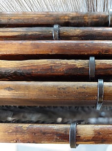The wooden shuttle with the pirn inside it takes the woollen yarn across the loom and back. These shuttles travel across the loom at up to 50kph so they have to be very durable. You can see the metal components at either end.
