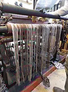 The yarn arrived in our weaving shed on 1kg cones. It was then wound onto bobbins on the bobbin winder, the only electricity powered piece of our Hattersley Domestic Weaving System.