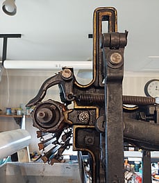 Our c1895 computer system that tells the rotating shuttle box when to turn clockwise or anti-clockwise to change the weft stripe colours. The Foulden collection had such a long chain that Rod had to design and make a larger box to hold it all.