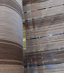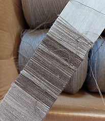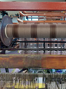 Showing the stripes on the warping mill. Each stripe has to be wound individually onto our sectional warping mill, meaning the chocolate bobbins come off and the taupe bobbins go on.
