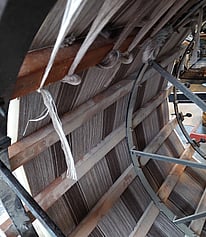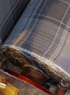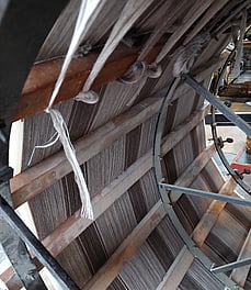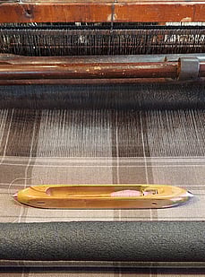 The wooden shuttle with the pirn inside it takes the woollen yarn across the loom and back. These shuttles travel across the loom at up to 50kph so they have to be very durable. You can see the metal components at either end.