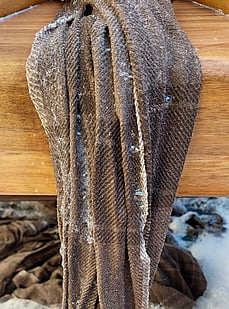 After many hours of pedaling the loom, the length of fabric is complete. Now it is time to check all the fabric and darn in any loose ends or knots. Although this can sometimes take two or three days, this warp is really clean and only took about six hours to check.