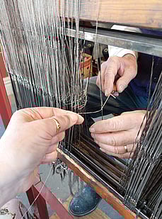 Sue sits inside the threading frame and hands each individual strand of wool to Rod, who threads it through it's correct heddle on it's correct shaft. This is time consuming, and if a mistake is made, it's not usually found until it's on the loom and you've started weaving. This is not good.