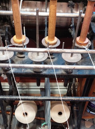 The first step to to wind the yarn off the large cones onto our wooden bobbins. Rod will be winding nearly 150 bobbins to fit onto the warping frame.