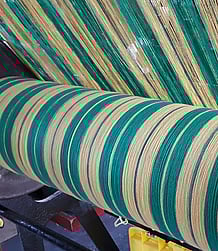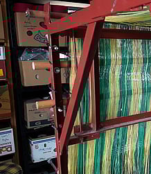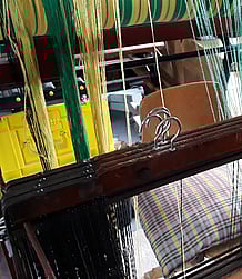 Sunshine yellow and apple green lambswool bring joy and vibrancy to our Leven collection of scarves, little blankets and throws. Woven with South Island grown and processed lambswool the Leven collection includes stripes and a tartan, woven on our Hattersley tappet loom #1 which has a rotating shuttle box and really early, as in 1895 computer system that makes weaving stripes and tartan so much easier. Have a look at the photos below to see some of the production sequence.