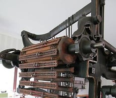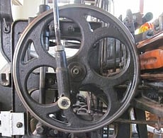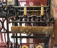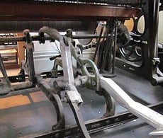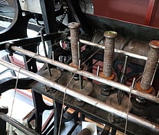 The Hattersley Domestic Weaving System was designed by George Hattersley and Sons in Keighley, northern England in 1895, responding to a need for a compact treadle operated loom which could be used in domestic settings in remote locations to weave semi-commercial lengths of fabric, usually supplying local woollen and weaving mills. The cast iron looms were designed to take the place of wooden hand looms, and use much of the technology developed for power looms. Each of our three looms have foot pedals and are treadled which makes producing fabric easier and faster than weaving on hand looms, as all the motions of the loom are connected through a crankshaft and gear wheels.