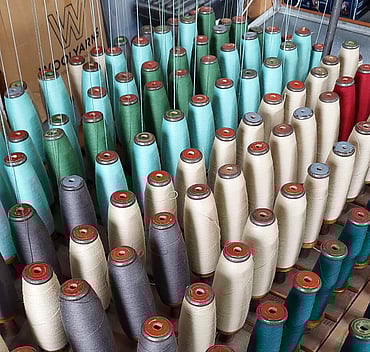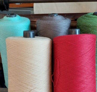 The fleece is spun into really fine yarn, and then two strands of it are twisted together to make it stronger for us to weave. There are no chemicals or special finishes used in this process, it's just natural wool dyed and spun as ecologically as possible.