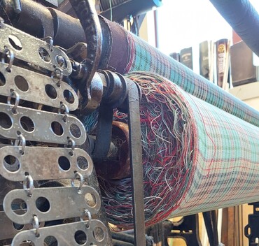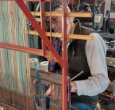 The first few rows of weaving. At this stage Rod tunes the loom, adjusting the weights, the strength that the beater beats each row of weaving, the tensions and how the fabric rolls on as he weaves.