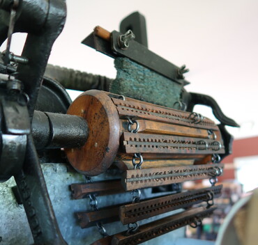 The 1895 computer system that operates the rotating shuttle box while Rod weaves. He makes up a new chain for each tartan - this is the chain for the Waitaki tartan.