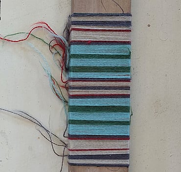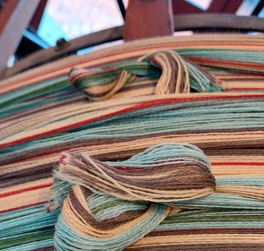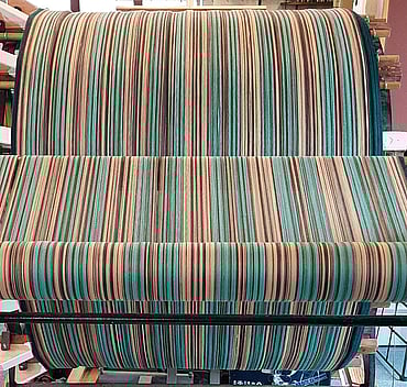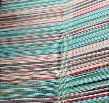 Showcasing the warp stripes as the warp is wound onto the back beam, in prepartion for threading through the heddles on the shaft. This process is called 'beaming'.