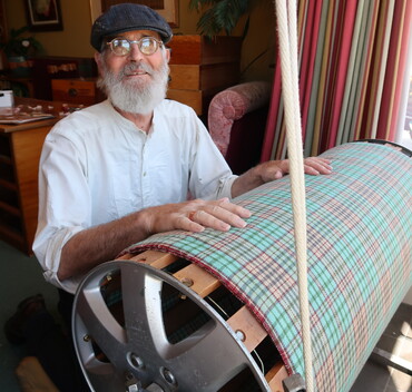 Then Rod stretches the wet fabric onto the wooden roller he made, in our lounge's bay window, so the sun can dry it. As there are no fabric finishing factories in New Zealand Rod has invented and constructed his own.